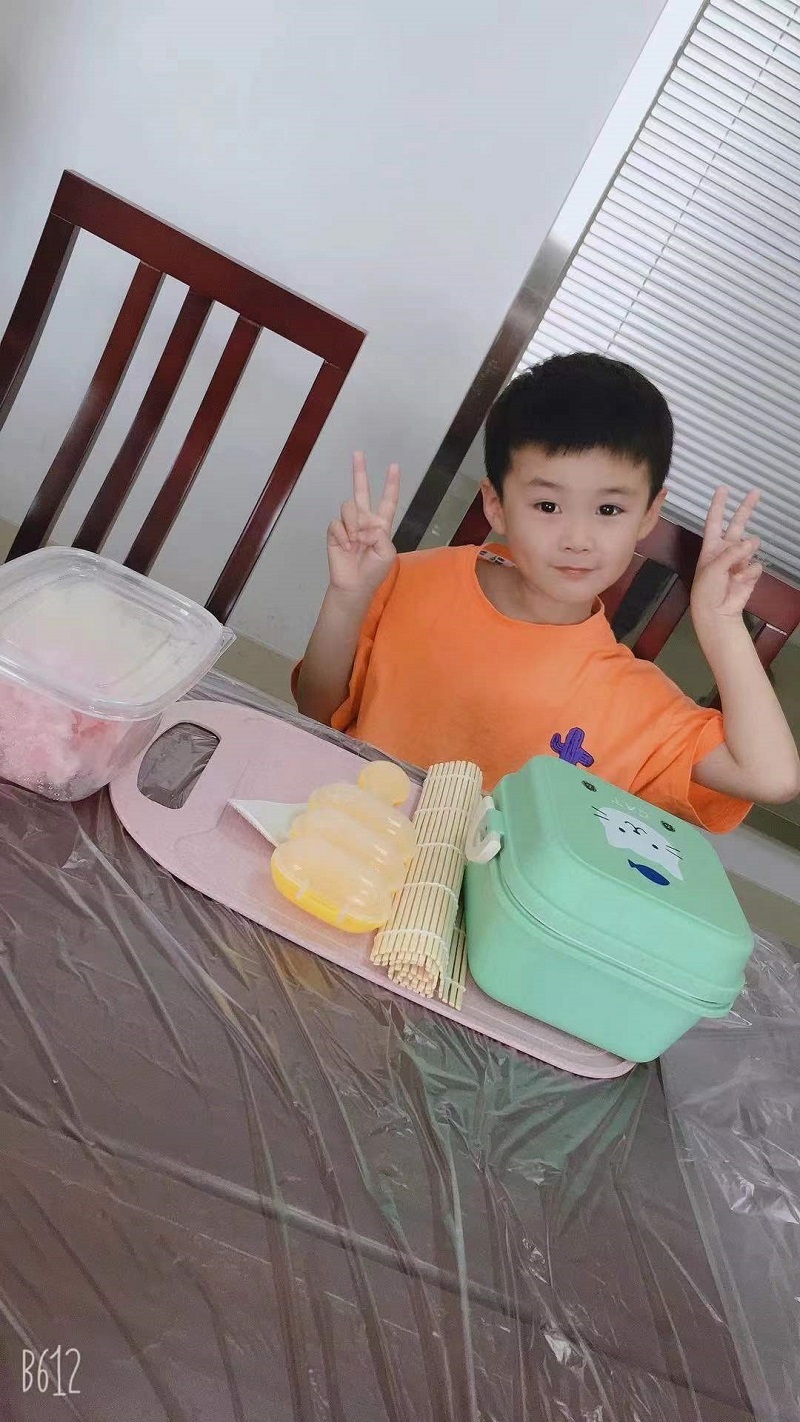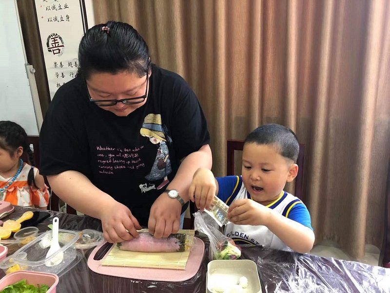 此次的美食DIY是寿司制作,活动开始,老师先展示了做寿司的工具、食材和一些辅助材料,详细讲解了寿司的制作步骤和注意事项,叮嘱小朋友们注意刀具并尽量交给大人使用。还没等老师讲解完毕,有的小朋友就迫不及待动手做起来了。老师似乎是早就预料到这种情况,早早准备好了摇摇乐,让小朋友们简单、便捷地就能完成球形小饭团的制作。活动中,大小朋友们根据老师提供的食材,发挥自己的创意,制作出形态各异的寿司,摆好造型放在可爱的食盒里,个个食色俱佳,让人忍不住食指大动。